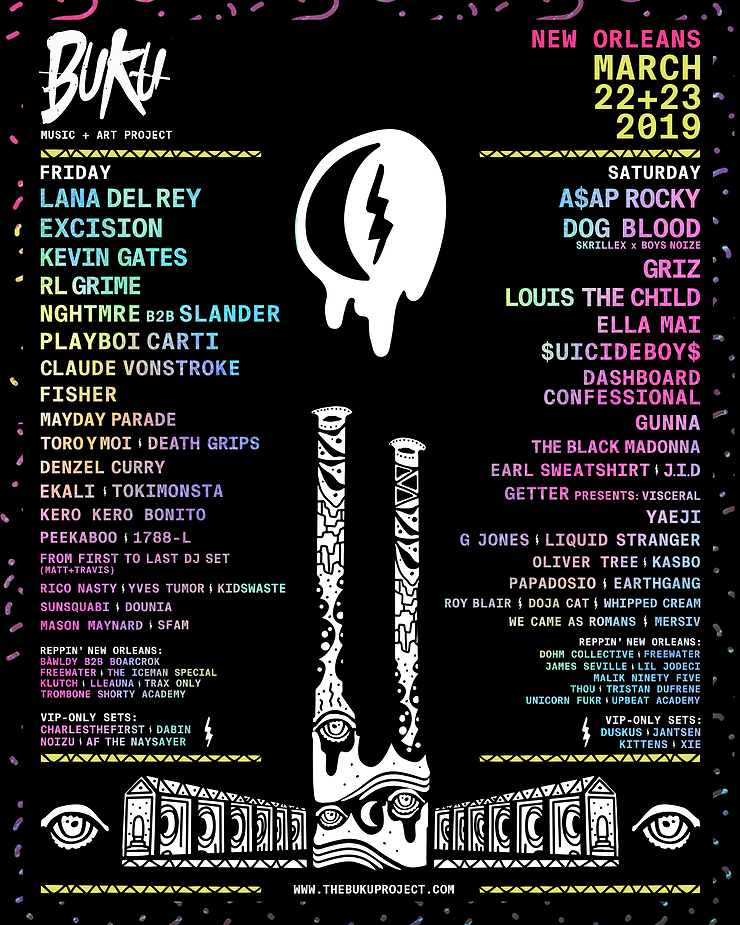 BUKU Project has announced their official lineup for 2019 and it does not disappoint! They’re bringing lots of heavy hitters from a variety of musical backgrounds to the Big Easy including Lana Del Rey, A$AP Rocky, RL Grime, Kevin Gate, Earl Sweatshirt, Ella Mai, Mayday Parade, and more. Easily one of the most diverse lineups I’ve seen in awhile. Scroll down to view the daily lineup.