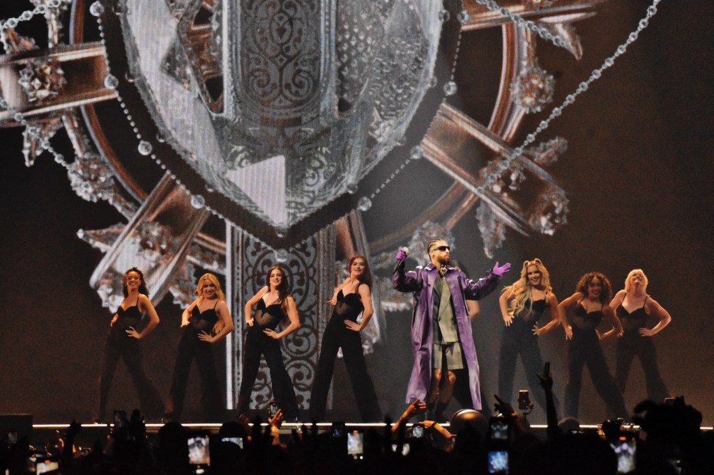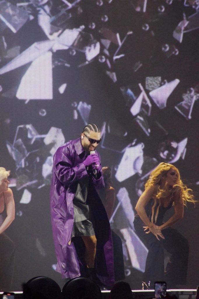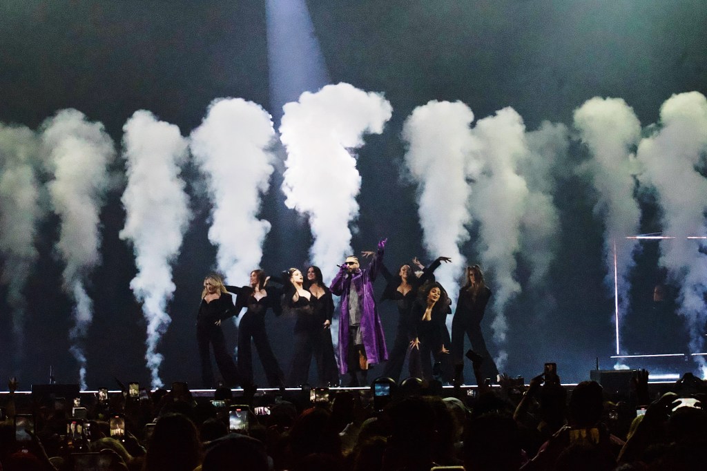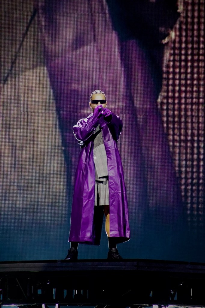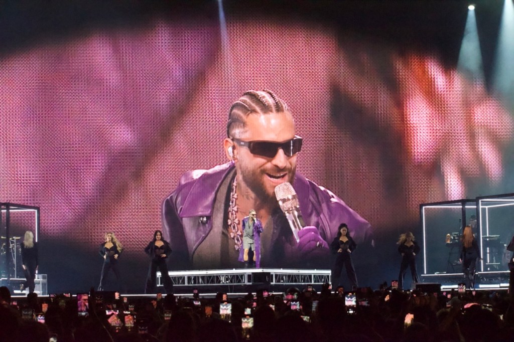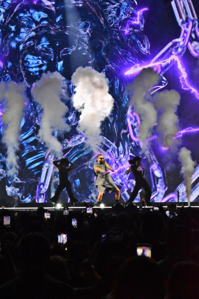 The set design was relatively simple – colorful, animated graphics that paired with each song along with the occasional pyrotechnics and smoke. Halfway through the show, he performed on an elevated B-stage located on the back of the arena floor. An inflatable dog similar to the one on the cover of his 2022 “The Love & Sex Tape” album was behind him as he performed songs like “Mojando asientos,” “El perdedor,” “Madrid,” and “Djadja (Remix).”